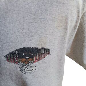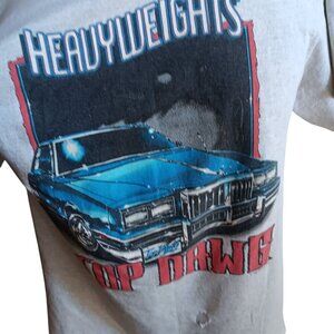 This large vintage T-shirt showcases a bold 1990s Top Dawg Heavyweights Cadillac graphic. Its well-worn condition adds character, making it an ideal piece for collectors and enthusiasts of retro fashion.