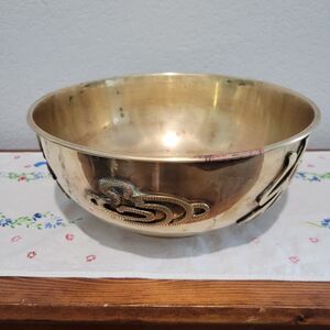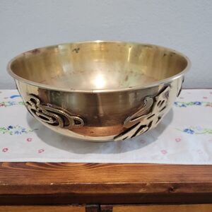 Large Vintage Brass Bowl with Chinese Characters Chinoiserie MCM Patina planter