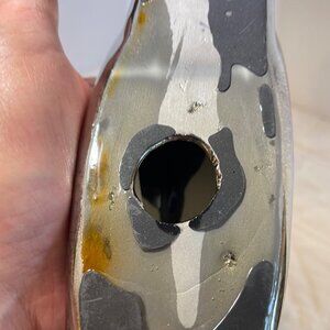 Small hole and This is pre owned, some minor scratches but in excellent condition. Height = 10 inches, Width = 10 inches, Depth = 3 inches.
