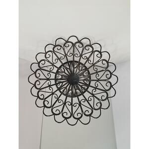 This large vintage ornate art metal scroll wire basket is a heavy center piece fruit bowl that exudes French country style. The round, matte black bowl features a scroll pattern and intricate design, making it a perfect addition to any room for all occasions. Measuring 10.5" in length, 12.5" in height, and 12" in width, this decorative collectible is a unique and eye-catching piece for adult's department.