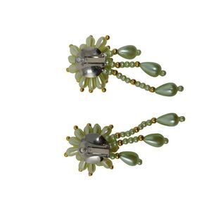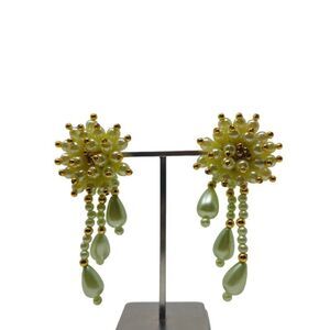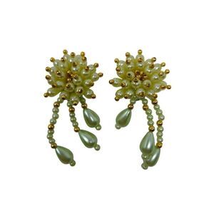 These unique vintage clip-on earrings from the 1980s-1990s feature a striking spiky pearl flower design in an unusual light greenish-yellow cream pearl color, accented with gold beads. Measuring 3.12" in length, these unsigned earrings are perfect for those who appreciate one-of-a-kind vintage finds. With their bold and daring design, they add an unexpected touch of elegance and whimsy to any outfit, ideal for collectors of rare statement jewelry.