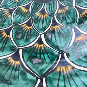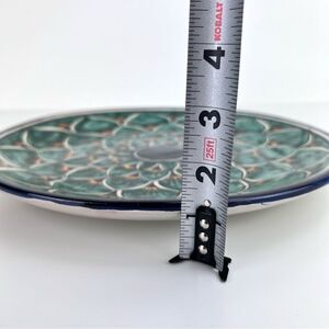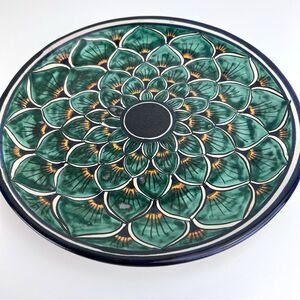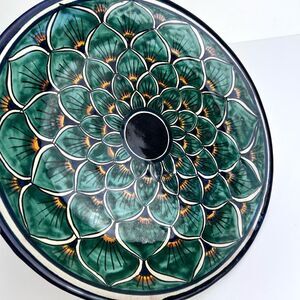 Preowned vintage handmade Talavera (?) plate. Not signed but the others that it came with were signed. Mexican pottery bowl. This exquisite hand-painted piece features a tropical colorful design of green, blue and yellow peacock design interior that adds a touch of vibrancy to any space.