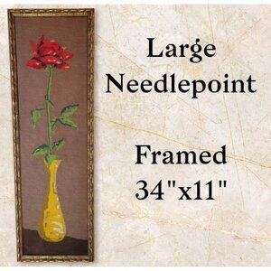 Large Vintage Tall Red Rose w/ Vase Needlepoint 34"x11" Complete Framed No Glass
