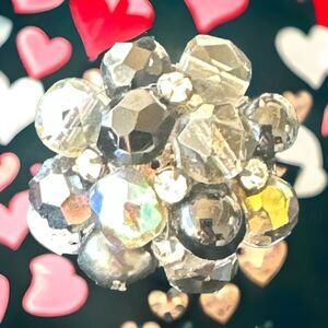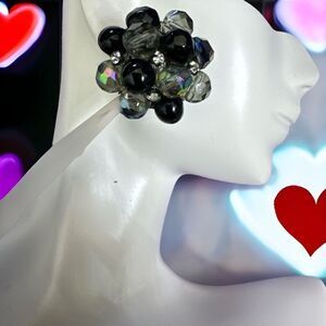 Large Vintage AB black crystal rhinestone cluster clip earrings by Vogue