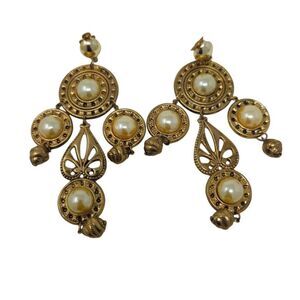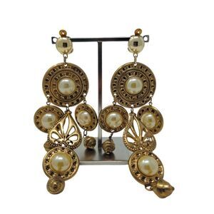 Large Vintage Gold Disk Runway Statement Pearl Cabochon Chandelier Clip-On Earri