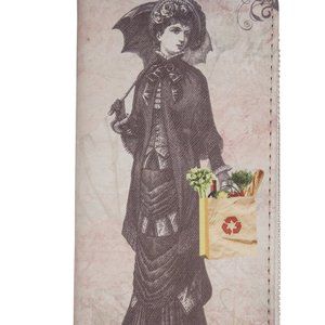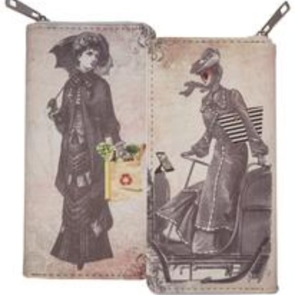 Large wallet featuring whimsical Victorian illustrations with a modern twist. Measures 7.5 " l x 4.1" w, with inside zippered coin pouch, 8 credit card slots, and 4 pockets for cash, coupons, receipts, etc. Vegan-friendly (all man-made materials); brand new; never used; tag still attached.
