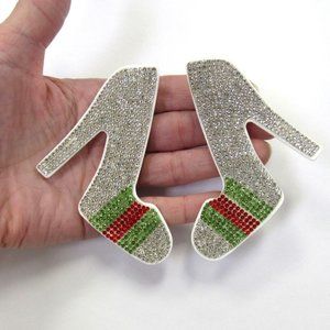 Large White, Red & Green Bling High Heel Shoe Sparkle Rhinestone Earrings