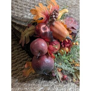 This vintage wicker basket cornucopia horn is a handmade, multicolor centerpiece perfect for Thanksgiving. Made in the United States in the 1990s, this unique piece features a blend of wood and plastic materials. It exudes a sense of Harvest Fall charm and would make a perfect addition to any seasonal decor collection. Its rustic appeal and traditional design make it a standout piece for celebrating the Thanksgiving holiday.