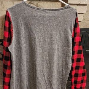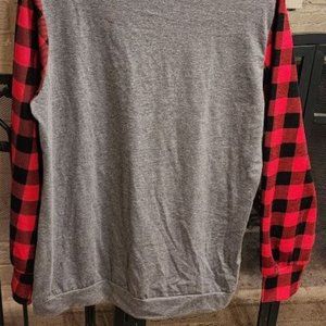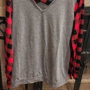 Large gray top with black and red checkered sleeves. Only worn once. 65% Cotton/35% Polyester