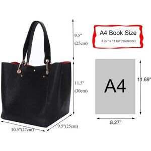 Womens Purse size: 9.5"LX10.5"WX11.5"H,(25Lx27Wx30H cm).The height of the handbag is approximately equal to the longest side of an A4 paper.The height of the hand strap is 9.8"(25cm).The height of the shoulder strap is 13.38inches(34cm).Weight is about 2.31LBS(1.05KG)