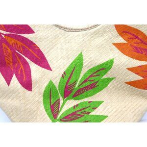 This stylish woven straw tote bag is designed with vibrant leaf patterns in pink, green, and orange. Featuring sturdy circular handles, it offers ample space for carrying essentials. Its neutral beige tone complements the lively hues, making it a versatile accessory for various occasions.