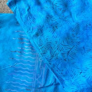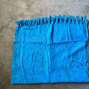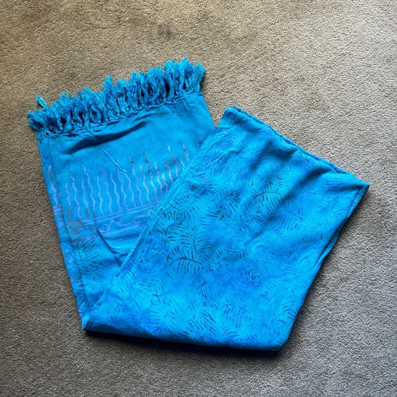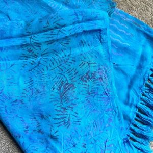 This lightweight material is a beautiful blue with a pattern. It’s 5 feet 3 inches in length and 3 feet 9 inches in width. 100% rayon made in Indonesia. This can be worn as a sarong, bathing suit cover-up , skirt or a Wrap. It’s all in the imagination. Excellent condition.