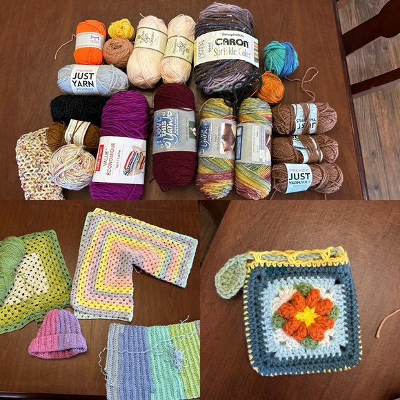 This is a large yarn lot of about 10 full skeins/balls. With some partial skeins. As well as an old project clear out. The projects can be easily taken apart and balled/caked. I am also adding to the lot a completed beanie hat and drawstring flower pouch. All have been kept in a plastic box away from dust, pets, and my house is a smoke free home. Most of the yarn is acrylic 4 weight yarn.