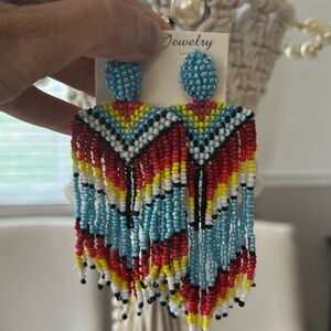 Large beaded dangle earrings ethnic Navajo style turquoise red