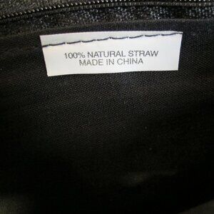Large black zippered straw bag. This has large, sturdy handles and an inside zippered pocket. Dimensions: top 20” wide, base 11” wide, 12.5” high (22” with handles up), 5” deep NEVER USED.