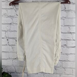 They are Large with a drawstring for a customized and comfortable fit. They have slant pockets along the seams and two pockets in back. The fabric is somewhat stretchy but cotton for the most part.