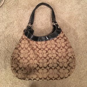 Lightly used, small wear spot on back from rubbing against clothes but in great condition otherwise, 3 large compartments with small pockets and zippers inside, middle is a large zipper compartment, removable bow, easily worn on shoulder