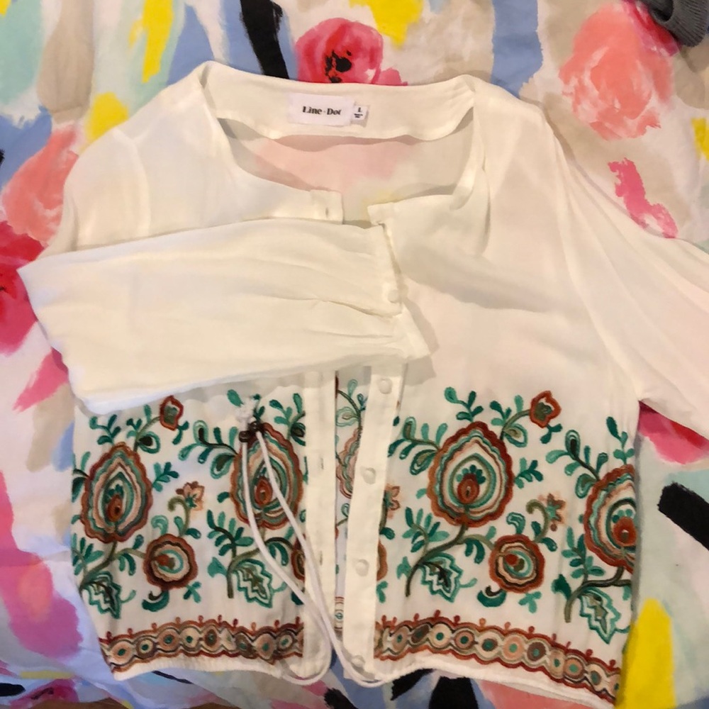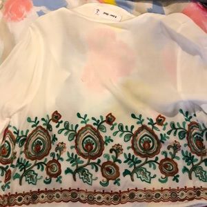 Gorgeous pattern! White button down that crops around the waist, strings at the bottom tie to make it more fitted. Worn once.