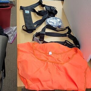 A great assortment of dog items. There is a dog seat belt by Aspen Dog Products size large, a adjustable harness. We have included a blue 6m dog lead. And also a neon orange vest you can wear when you're walking your furry friend.
