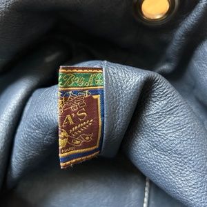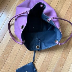 Large tote, 15” across base, 18” across top, 6.5” wide, 12” tall (excluding handle, which is another 10-11”). Lovely fuschia/pink/purple color on outside, navy on inside. I believe it is real leather, made in Italy. Has metal grommets along the top and comes with two fasteners that go through the grommets and allow you to close or narrow the top, or to fold in the sides for a more structured look (see picture). Some wear, but still in very good condition.