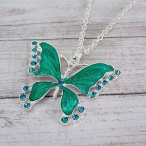 Beautiful green sparkle enamel and crystal large butterfly pendant necklace. It is created with a green enamel with sparkles in it, and light blue crystals. It is in a shiny silver plated finish and suspended to a silver link chain. Nice for everyday wear or any special occasion. New and never worn.