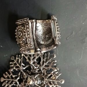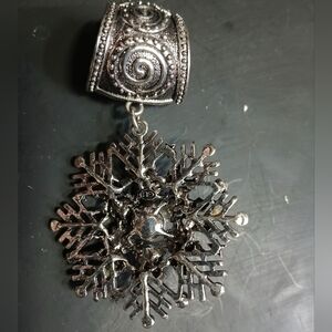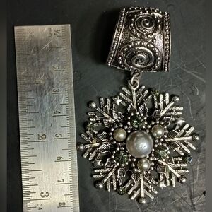 Large huge silvertone snowflake green crystal faux pearl pendant marked gb