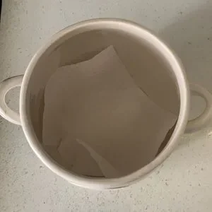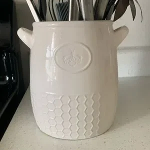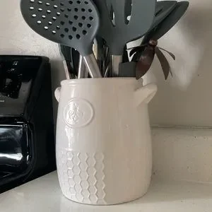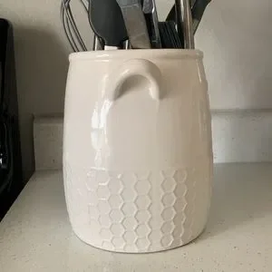 Creamy white. A foot tall, 6 inches wide, 6 inches long. Used for kitchen utensils, could be a pot for plants! Condition: lightly used