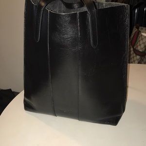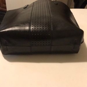 Black leather with center perforated design. Open closure. 8’ straps. Leather lining. A stain on lining. Good condition durable & roomy