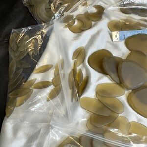 A large lot of similar colored gemstones for jewelry making. Smoky quartz &/or colored Czech glass appear to be types. The shapes include healer/moon shaped, flat and cylindrical teardrop marquis, leaf plus flat & faceted irregular "guitar pick" shaped. These are all ready to be placed in jewel settings.