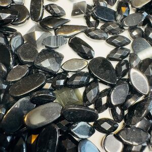 A large lot of small black obsidian gemstones for jewelry making. Some of the shapes are oval, marquise, pear, cushion, arrowhead & round. 1/2 to 1 inches are approximate sizes.