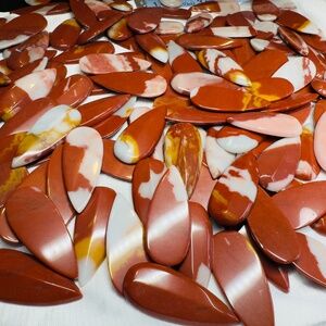 A large lot of reddish, brown, coral, gold, champagne & orange gemstones for jewelry making. These appear to be natural Noreena Jasper & mookite cabochons, all shapes are oval, both flat & faceted. 1 3/4 - 2 1/4 inches are approximate sizes.