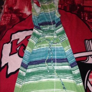 Green white and blue striped Sonoma maxi dress. Braided ties for back or front.