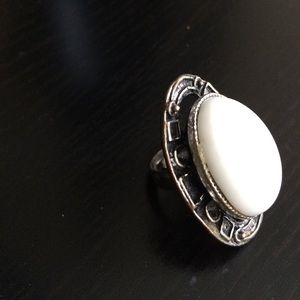 I found this piece randomly, but have the tiniest of hands and fingers so it never looked right. This large statement piece comes with an adjustable band, so it can be worn on multiple fingers of differing size. The back looks a bit bent, but that's from adjusting it repeatedly. This is on the heavier side but is balanced so it won't spin around your finger.