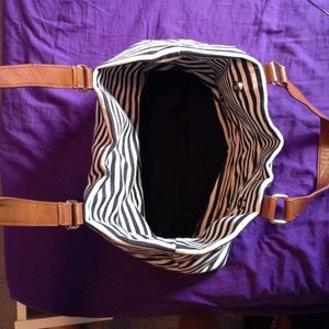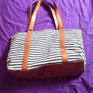 Blue and white striped purse with brown leather straps and bottom. Good condition.