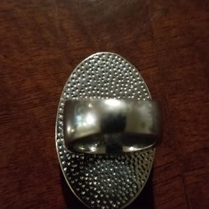Gorgeous, large blue statement ring. I don't remember the size but it fits my finger that is approximately a size 7. I don't know the stone. In good condition with no tarnish. Make a statement with this item.