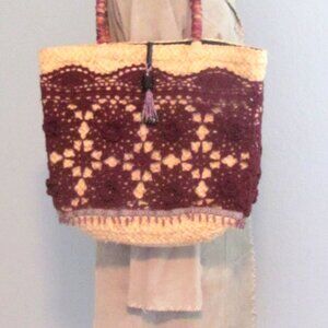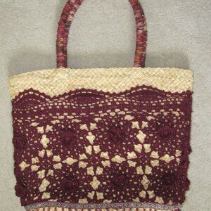 This large shoulder bag started out as a summer straw tote but was very plain. I added a vintage burgundy crocheted dresser scarf. Around the lower edge I attached a brocade ribbon and bead fringe. Handles are wrapped with lovely ombre ribbons. A glass beaded tassel serves to keep bag closed at the top.