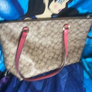 The leather on this bag is in excellent condition, the inner upholstery is looking a little rough and is in need of some cleaning. Designer pink and tan coach bag.