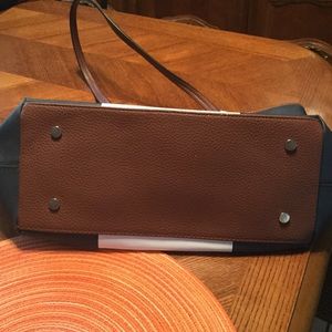 Large navy white tote with lots of spots for storage cell phone and glasses. No stains in the lining. 14 1/2 X 9 1/2 X 5. Three sections with lots of storage space.