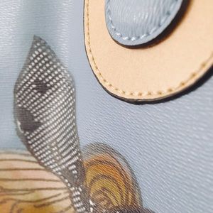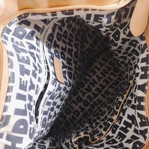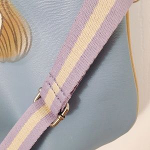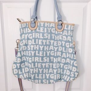 This adorable tote bag is made out a very firm and good material. It has a cute design of a girl on the cover and has a unique word design on the back and inside with pastel blue colors. It also comes with a pastel yellow and purple strap. Open to offers!