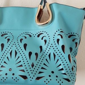 EUC. Faux leather with cutout design on front and back being solid. Gold metal detailing around strap. The measurments are as follows (all are approximate measurements):