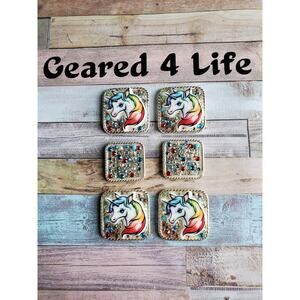 4 unicorn bling concho set 1 1/2" and 2 bling 1 1/4" replacement saddle conchos custom set of conchos Set of 6 Square screw back. We use a combination of Swarovski and percosia crystal and stones for bling to give a unique effect please pm for customization requests. Handcrafted western tack bling great way to snazzy up your bridle or other tack can also customize colors and styles. Plated screwback concho with sealed in clear poly resin. Easy to add to a belt, purse, wallet, backpack and really anything you can punch a hole in or can covert into a pendant or drawer pull use your imagination. Conchos can also can used as a focal pendant or made into a bridle rosette, earrings, necklaces, rings, bracelets, tack accessories, bling for your chaps, saddle blanket, flip flops, key chains, dog collars, halters and more Thanks for looking!