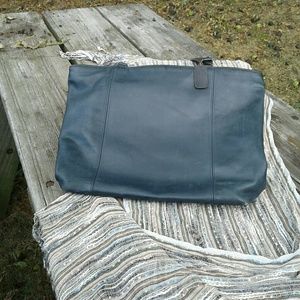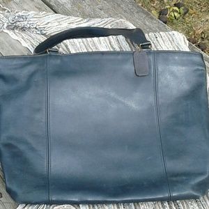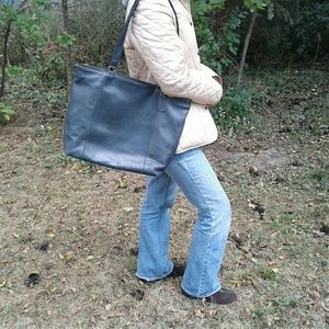 Vintage, dark-blue leather, large Coach tote. Used, some scuffing on both sides. Has that 'worn in' feel.