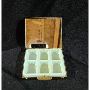 Sturdy vintage brass box with a round Rococo style porcelain cameo on the front. Latch works perfect. Has a mirror on inside lid.