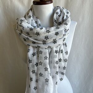 Large white scarf with gray flowers. Good preowned condition. Soft, gauzy texture. Measures 75” x 35”. Can be worn in lots of different ways.