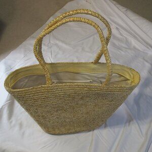 Large zippered straw bag with natural coloring. This has large, sturdy handles and an inside zippered pocket. Dimensions: top 20” wide, base 11” wide, 12.5” high (22” with handles up), 5” deep NEVER USED.