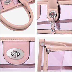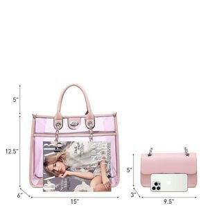 2 piece clear pink bag set. Includes one large tote bags and a smaller crossbody bag made of clear PVC and vegan leather.