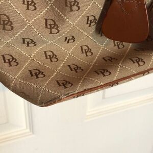 Beautiful large Dooney & Bourke tan and brown shoulder bag. Slight wear on bottom corners( pictured). Light staining thank n bottom inside, Otherwise great condition