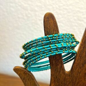 The majority of the set are turquoise or teal colored. The other five separate bracelets are purple, blue, red, orange and pink.