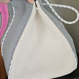 Large gray and white neoprene expandable tote/beach bag with wristlet and snap closure. There is a slight dark spot per the picture but otherwise it's in great previously owned condition.