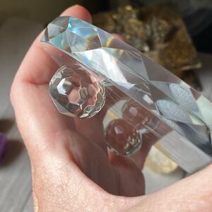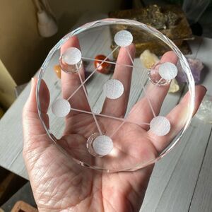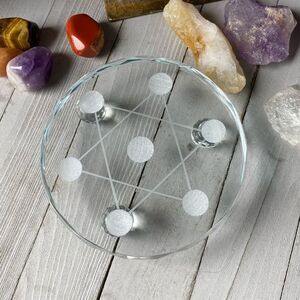 This glass grid plate is unique as it has slight grooves perfect for holding spheres or other crystals.